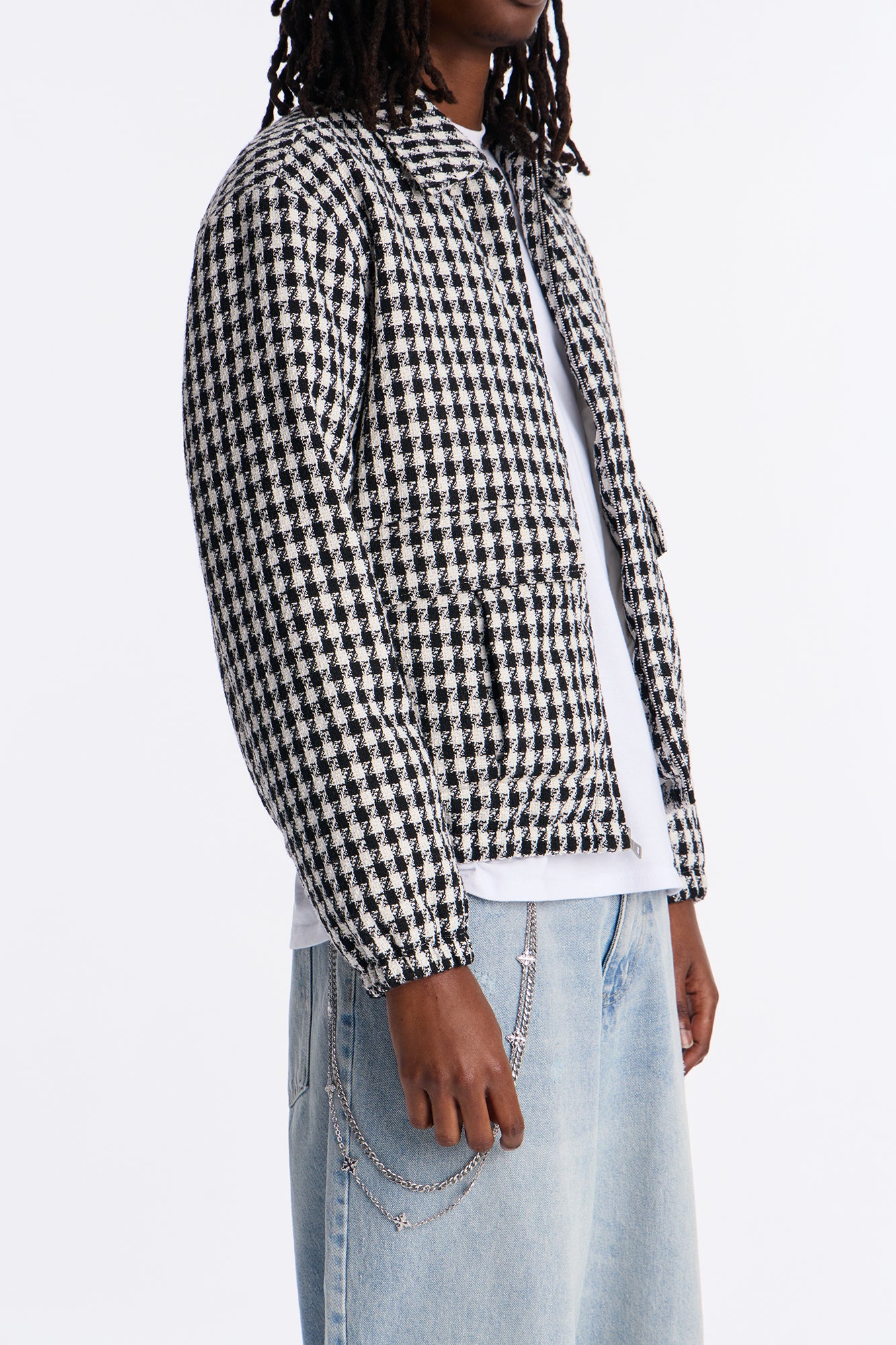Key features include a zip-front closure for easy wear, ribbed cuffs and hem for a secure fit, and two front pockets for practicality. The black and white checkered motif offers versatile styling options—pair it with jeans and boots for a casual look or chinos and loafers for smart-casual outfits. Designed with a tailored Ludlow fit, it flatters various body types while ensuring freedom of movement.