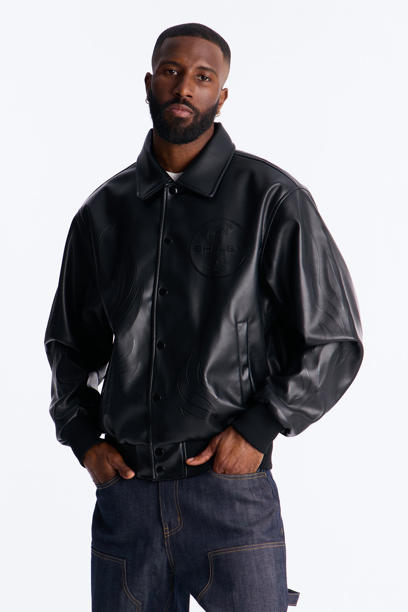 Elevate your style with the Shelby Racing Embossed Faux Leather Jacket in sleek black. Crafted from high-quality faux leather with a distinctive embossed racing pattern inspired by iconic Shelby designs, this jacket offers a premium look without the use of real leather. Perfect for motorsport enthusiasts, casual outings, or adding edge to your everyday wardrobe.